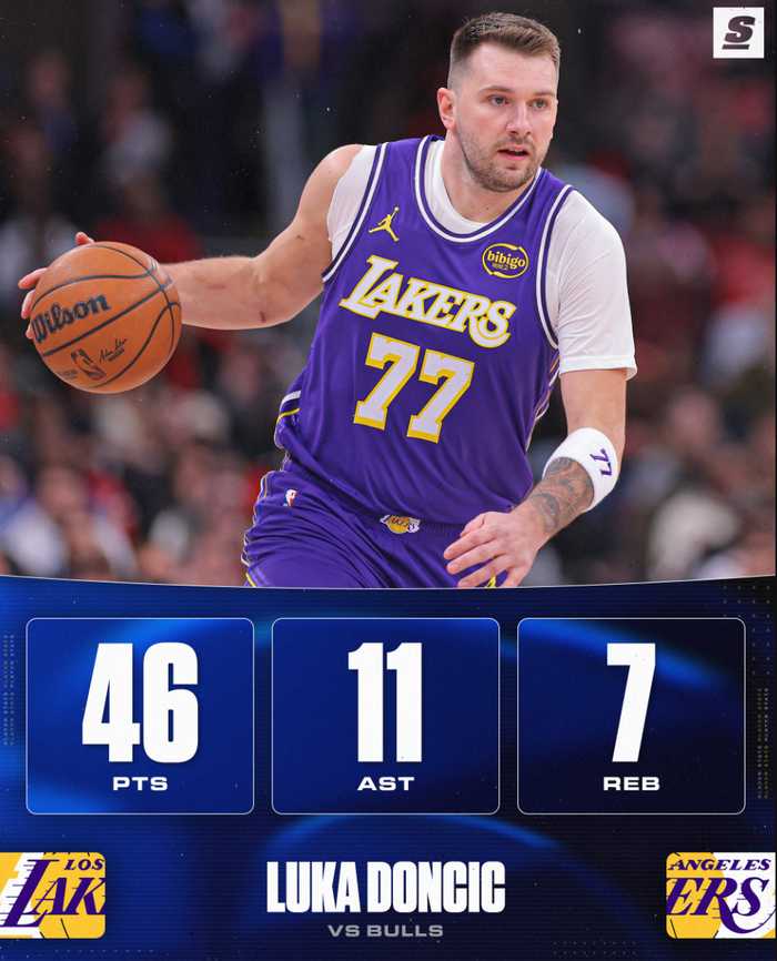 卢卡-东契奇在对阵公牛的比赛中,第三节单节狂轰20分,全场比赛38分钟,25中15,三分14中8,拿到46分11助攻7篮板,命中率60%,三分命中率57.1%,真实命中率76%,正负值+6。
