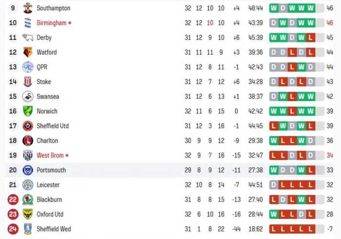 被扣除6个积分后,莱斯特城目前和降级区的布莱克本同积32分。