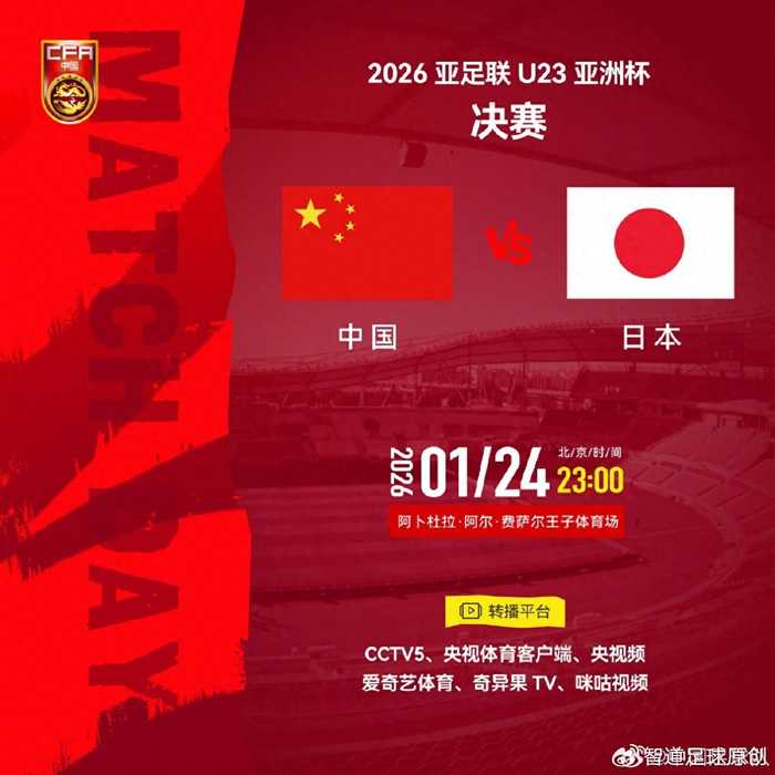 北京时间1月24日晚上23时,中国足球有大赛,那就是中国男足时隔22年再一次要踢决赛了,上一次还要追溯到2004年亚洲杯,决赛国足1-3不敌日本丢冠,日本的第二个进球是手球,因为国足丢冠有点冤。这一次国足U23再一次与日本争冠,U23亚洲杯决赛在阿卜杜拉·阿尔·费萨尔王子体育场打响,央视CCTV5将会直播本场比赛,大家守住电视机一起为国足U23加油!